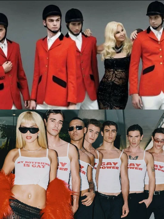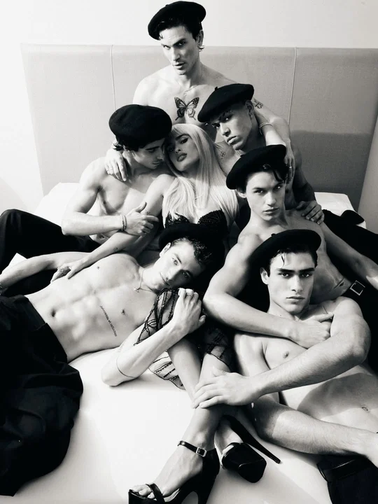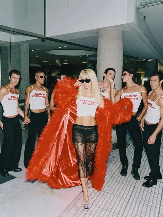 El proyecto contó con dirección creativa del estilista Lucas Mata y reunió a un equipo de modelos y asistentes que acompañaron la puesta en escena. En una de las imágenes más destacadas, Poggio apareció con una boa de plumas rojas, mini vestido negro con detalles de encaje, gafas oscuras y una peluca rubia inspirada en el estilo característico de Susana Giménez.