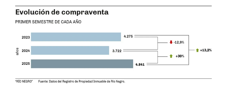 El mercado inmobiliario de Río Negro registró un crecimiento del 30% en el primer semestre de 2025, en comparación con igual período del año anterior. De acuerdo con las estadísticas del Registro de la Propiedad Inmueble (RPI), entre enero y junio se inscribieron 4.841 escrituras de compraventa, frente a las 3.722 registradas en 2024, lo que equivale a 1.119 operaciones más.
