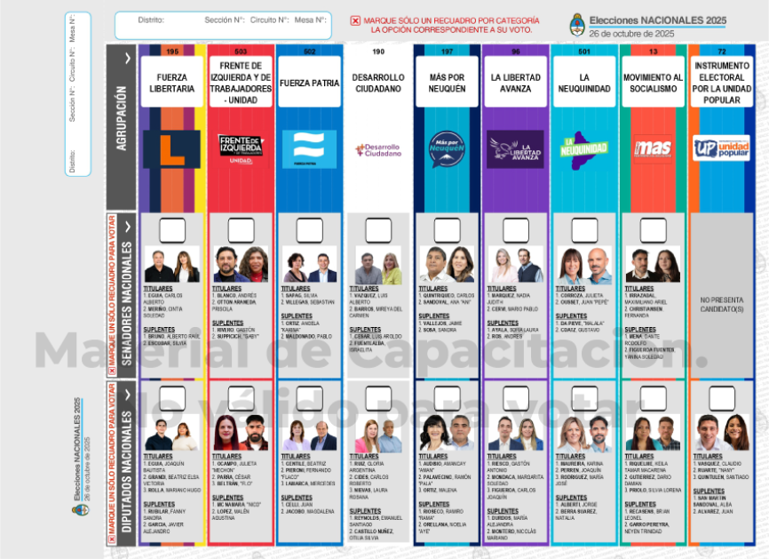 Cada agrupación tendrá su nombre, logotipo, color, foto de candidatos titulares y un casillero en blanco para que el votante marque su elección. El orden de aparición fue definido mediante un sorteo público realizado por la Justicia Electoral.