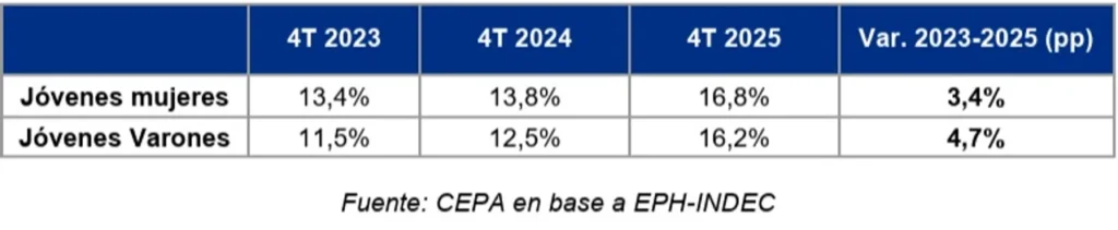La situación es más crítica entre los jóvenes. En el último trimestre de 2025, la tasa de desocupación llegó al 16,8% en mujeres de 14 a 29 años y al 16,2% en varones de la misma franja etaria, ambos niveles muy por encima del promedio general. El informe advierte que estas dificultades impactan en la autonomía económica, la continuidad educativa y el acceso a la vivienda, además de condicionar las trayectorias laborales futuras.