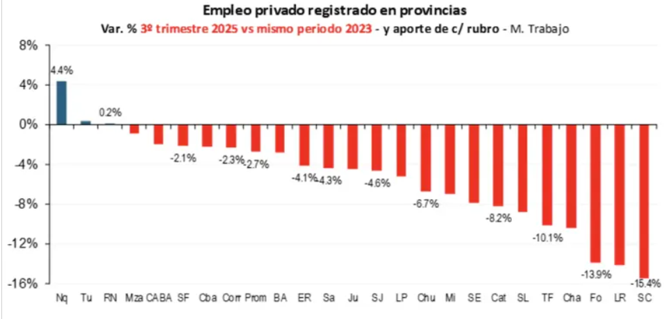 De las 24 jurisdicciones del país, solo tres mostraron crecimiento del empleo privado formal: Neuquén, Tucumán y Río Negro. El resto evidenció caídas, en muchos casos vinculadas a la parálisis de la obra pública, la menor asistencia nacional y el bajo dinamismo de algunas actividades.