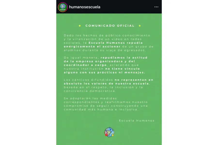 Desde la Escuela Humanos, la dirección difundió un comunicado en el que repudió “enérgicamente el accionar de un grupo de alumnos y del coordinador”, aclarando que “nuestra institución no tiene vínculo alguno con esas prácticas ni con los mensajes difundidos”. Además, subrayó que “los cánticos no representan en absoluto los valores de nuestra escuela, basada en el respeto, la inclusión y la convivencia democrática”, y anunció que se adoptarán medidas disciplinarias.