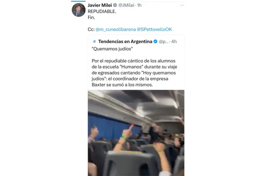 El presidente Javier Milei fue uno de los primeros en reaccionar públicamente: “Repudiable. Fin”, escribió en su cuenta de X, mensaje que luego editó para mencionar a la ministra de Capital Humano, Sandra Pettovello, y al ministro de Justicia, Mariano Cúneo Libarona. A su mensaje se sumaron el vocero presidencial, Manuel Adorni, el ministro de Economía, Luis Caputo, y referentes de distintos espacios políticos, entre ellos la diputada Sabrina Ajmechet y el exsecretario de Derechos Humanos Claudio Avruj, quien pidió trabajar la raíz del problema “desde la escuela y la formación ciudadana”.