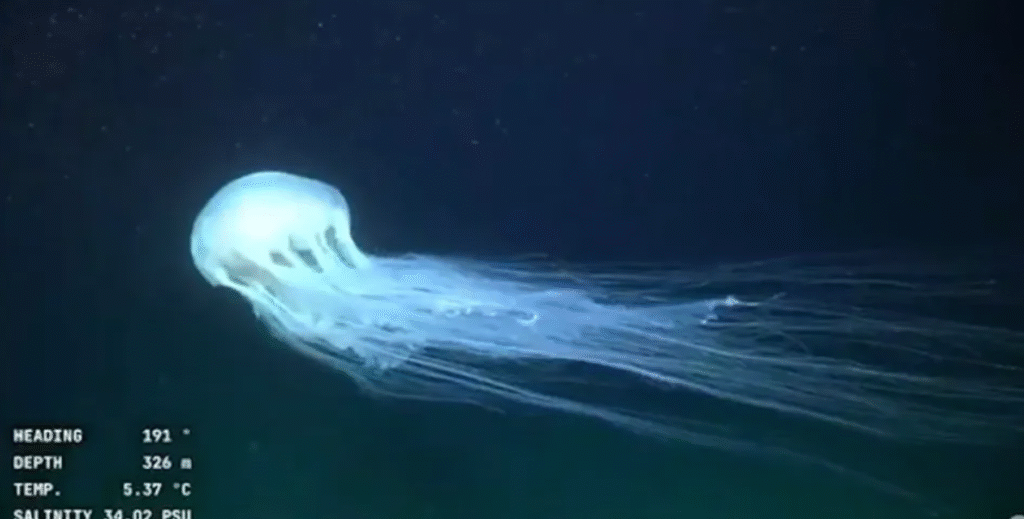 - Una gran medusa blanca, también conocida como aguaviva, con tentáculos que se mecen al ritmo de las corrientes.