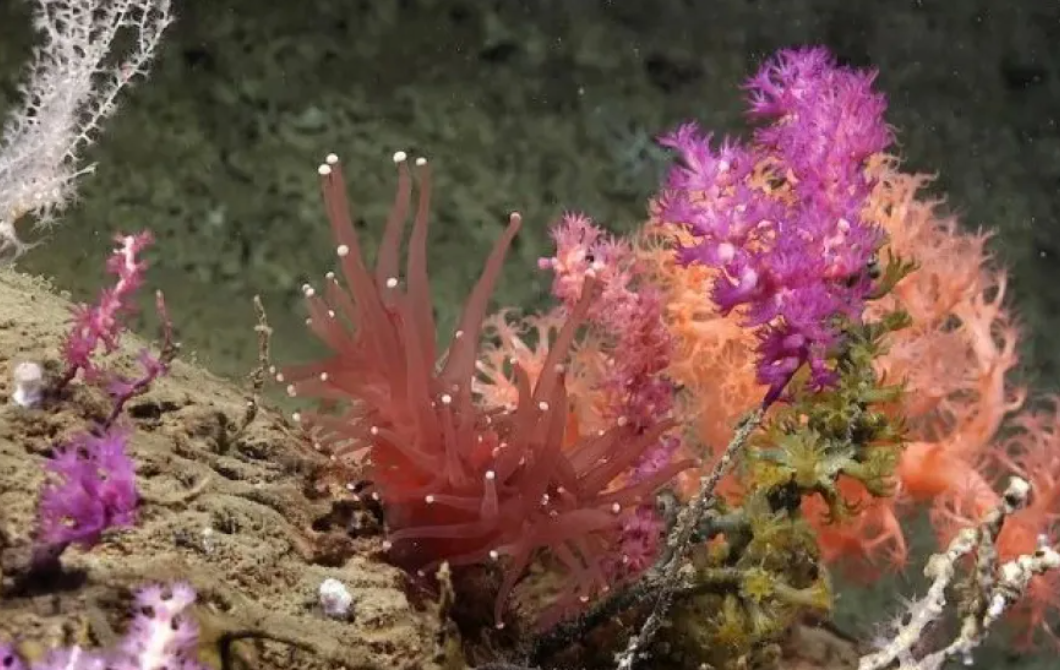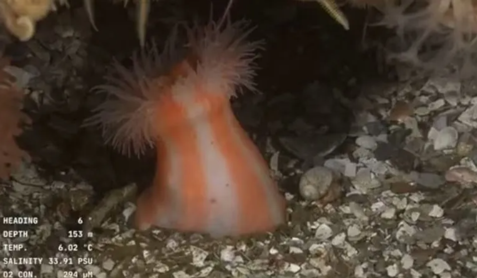 - Una anémona de rayas blancas y rojas, distinta a las habituales, que fue bautizada como “anémona en pijama”. Algunas especies alcanzan entre 1,25 centímetros y 2 metros de diámetro.