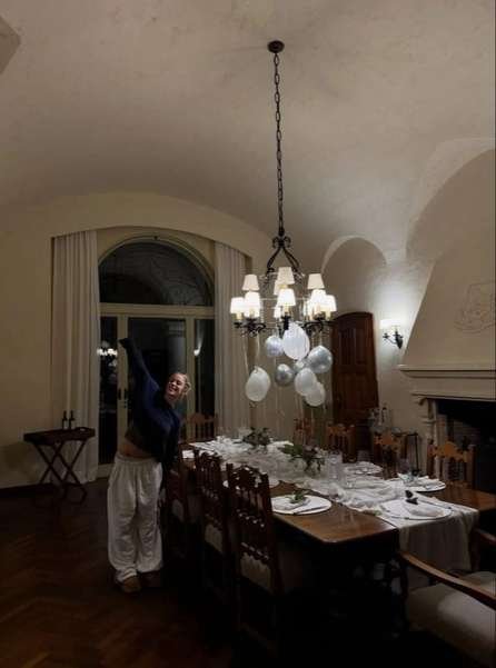 La celebración incluyó una cena con una estética simple, con decoración en tonos neutros y detalles minimalistas. La mesa principal combinó elementos sobrios con arreglos florales, en línea con el estilo elegido para la ocasión.
