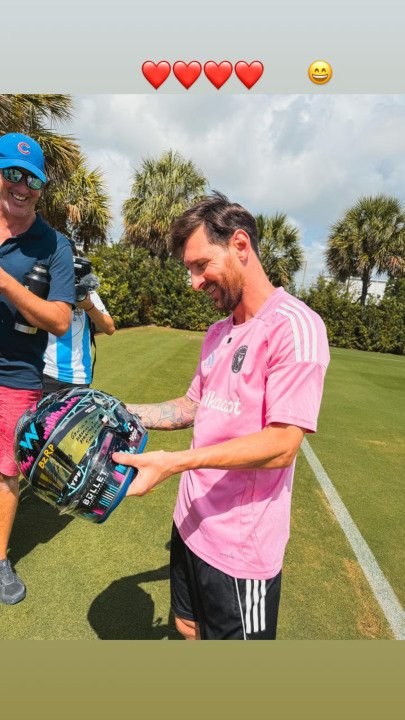 El joven piloto compartió la imagen del momento en Instagram, donde se lo ve al capitán de la Selección argentina sosteniendo el casco con una dedicatoria escrita: “Gracias por todas las alegrías y aprendizajes”.