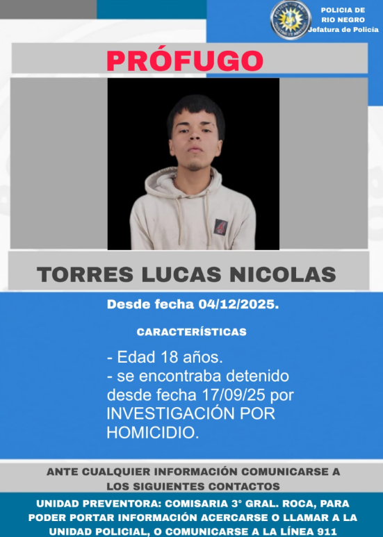 Roca amaneció este jueves con un fuerte despliegue policial tras la fuga de dos detenidos durante la madrugada en la comisaría Tercera. La situación generó preocupación en las autoridades, ya que uno de los evadidos está imputado en una causa de alto impacto social: el crimen de Julián Dobra, ocurrido en abril y que conmocionó a toda la región.