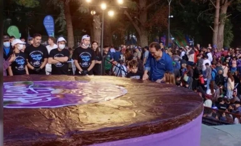 El cierre de la segunda jornada tuvo un momento central: el traslado y corte del alfajor más grande de la Patagonia. La pieza fue elaborada por una conocida panadería local con un equipo de siete personas que trabajó de manera exclusiva durante más de una semana previa al evento. El resultado fue contundente: 1.290 kilos de peso y cuatro metros de diámetro.