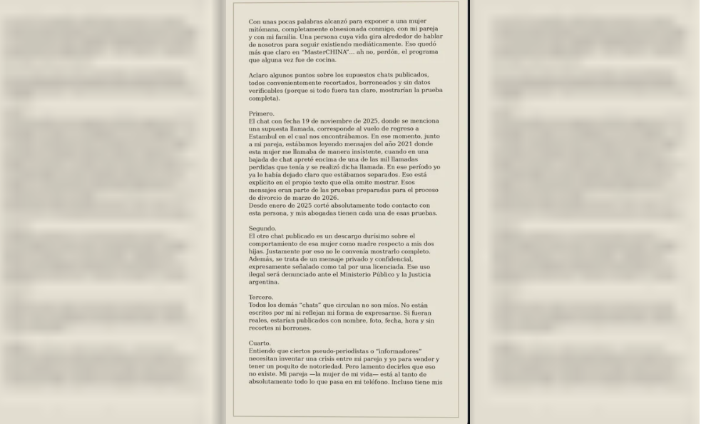 El otro chat publicado es un descargo durísimo sobre el comportamiento de esa mujer como madre respecto a mis dos hijas. Justamente por eso no le convenía mostrarlo completo. Además, se trata de un mensaje privado y confidencial, expresamente señalado como tal por una licenciada. Ese uso ilegal será denunciado ante el Ministerio Público y la Justicia argentina.