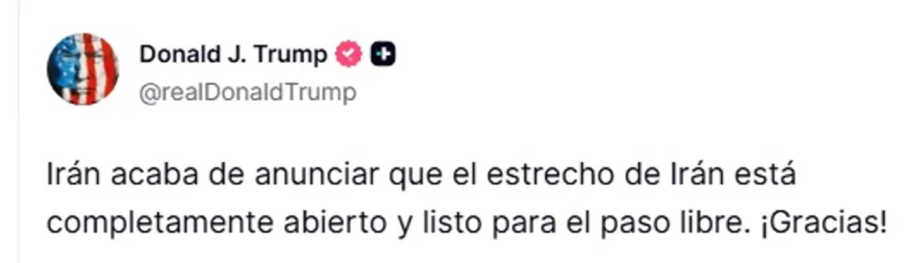 Trump, por su parte, sostuvo que el estrecho se encuentra “completamente abierto” y afirmó que Irán comenzó a retirar minas marinas con asistencia estadounidense, en el marco de un proceso que, según indicó, avanza hacia una resolución diplomática del conflicto.