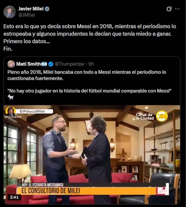 El posteo se realizó poco después de la visita de Messi al presidente Donald Trump en la Casa Blanca, tras la consagración del Inter Miami CF en la Major League Soccer 2025. En su mensaje en X, Milei escribió: “Esto era lo que yo decía sobre Messi en 2018, mientras el periodismo lo estropeaba y algunos imprudentes le decían que tenía miedo a ganar. Primero los datos… Fin”.
