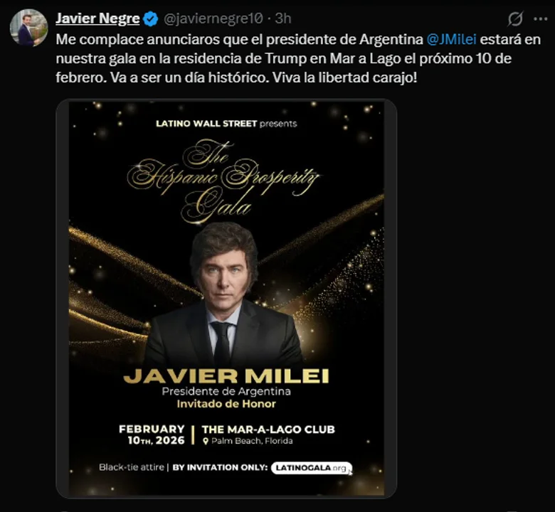 La información fue confirmada por Javier Negre, titular de Real America’s Voice Español y propietario de La Derecha Diario, quien destacó el evento en redes sociales y señaló que Milei disertará en la The Hispanic Prosperity Gala del Latino Wall Street, que se realizará en la residencia de Trump.
