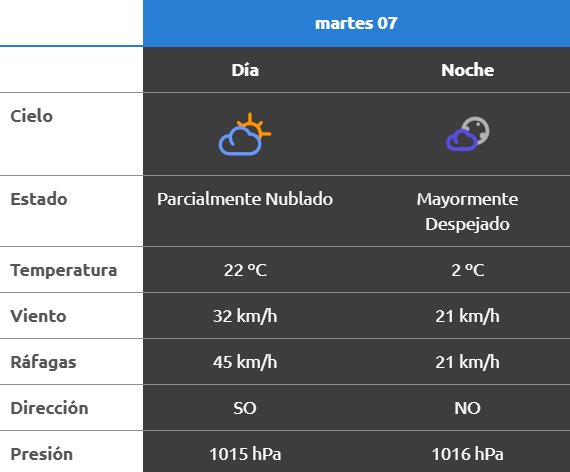 El parte del servicio meteorológico prevé que para después del mediodía el cielo estará ligeramente nublado y los vientos del sector oeste tendrán velocidades estimadas de entre 13 y 22 km/h. La temperatura pronosticada sería de 26 grados.