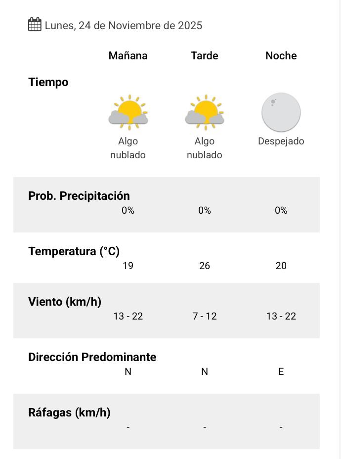 De acuerdo al parte del Servicio Meteorológico Nacional, el clima se presentaría sin lluvias, y los vientos del norte correrán a una velocidad de entre 13 y 22 kilómetros por hora. La humedad sería del 45 por ciento, y la visibilidad sería buena.