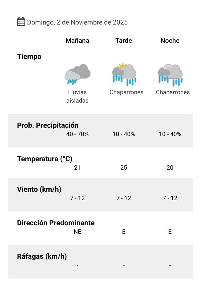 El parte del servicio meteorológico prevé que para después del mediodía el cielo estará con chaparrones y los vientos del sector noreste tendrán velocidades estimadas entre 7 y 12 km/h. La temperatura pronosticada sería de 25 grados.