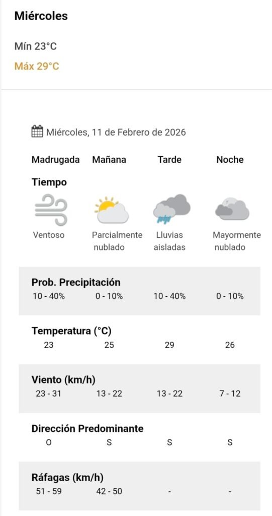 De acuerdo al parte del Servicio Meteorológico Nacional, el clima presenta una probabilidad de lluvia del 10 por ciento, y los vientos del sur correrán a una velocidad de entre 13 y 22 kilómetros por hora. La humedad sería del 56 por ciento, y la visibilidad sería buena.