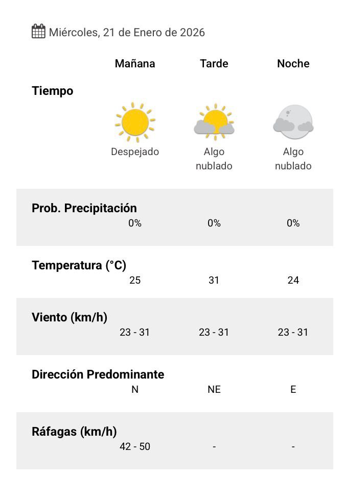 El parte del servicio meteorológico prevé que para después del mediodía el cielo estará algo nublado y los vientos del sector este tendrán velocidades estimadas de entre 23 y 31 km/h. La temperatura pronosticada sería de 31 grados.