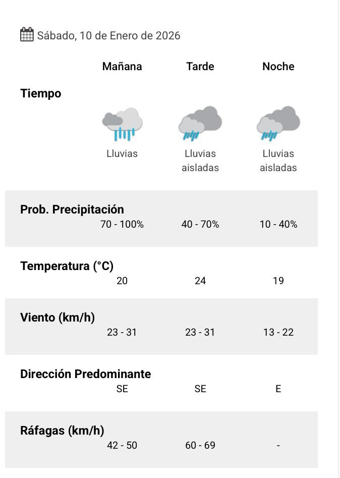 De acuerdo al parte del Servicio Meteorológico Nacional, el clima presenta una probabilidad de lluvia de entre el 70 y 100 por ciento, y los vientos del sudeste correrán a una velocidad de entre 23 y 31 kilómetros por hora. La humedad sería del 90 por ciento, y la visibilidad sería regular.