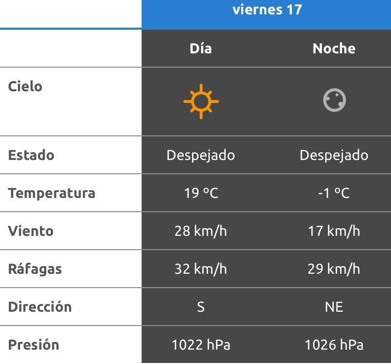 A la noche, el clima rondará los 16 grados, mientras que los vientos serán del noreste y soplarán a una velocidad de 23 y 31 kilómetros por hora. La probabilidad de lluvia estaría en el orden del por ciento para esta franja del día.