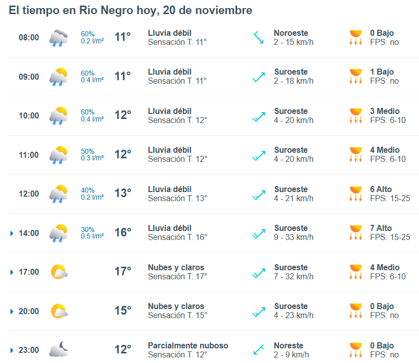 El pronóstico del tiempo para la ciudad de Río Negro, indica que hoy 20 de noviembre el cielo estará con lluvias aisladas por la mañana y la temperatura rondará entre 12 grados.