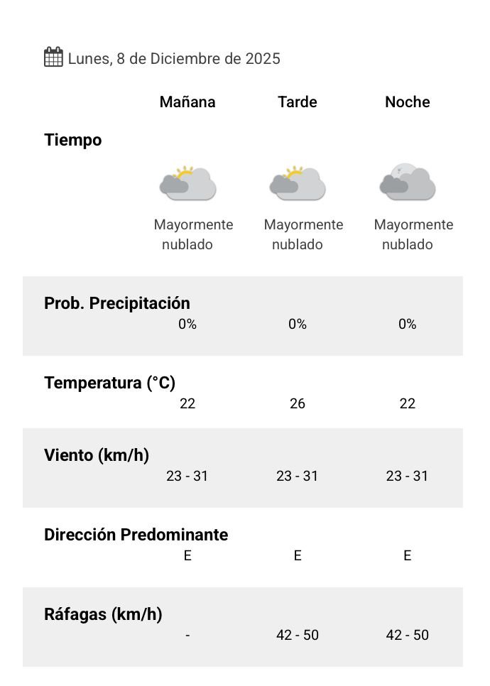 El parte del servicio meteorológico prevé que para después del mediodía el cielo estará mayormente nublado y los vientos del sector este tendrán velocidades estimadas de entre 23 y 31 km/h. La temperatura pronosticada sería de 26 grados.