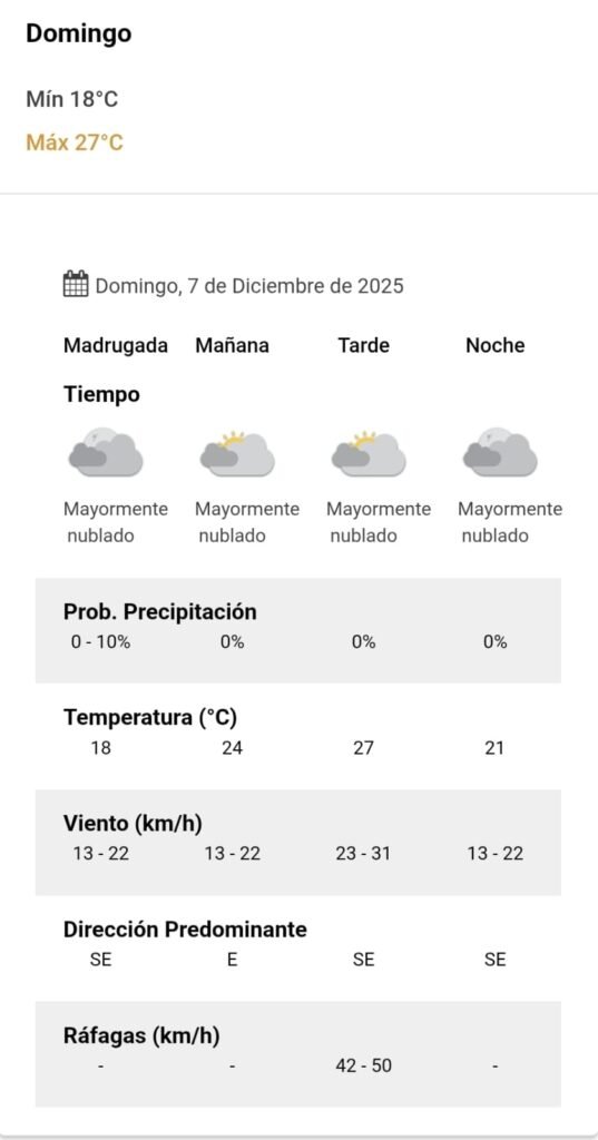El parte del servicio meteorológico prevé que para después del mediodía el cielo estará mayormente nublado y los vientos del sector sudeste tendrán velocidades estimadas de entre 23 y 31 km/h. La temperatura pronosticada sería de 27 grados.