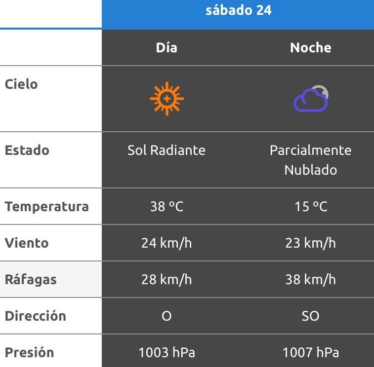El parte del servicio meteorológico prevé que para después del mediodía el cielo estará con tormentas aisladas y los vientos del sector oeste tendrán velocidades estimadas de entre 13 y 22 km/h. La temperatura pronosticada sería de 35 grados.
