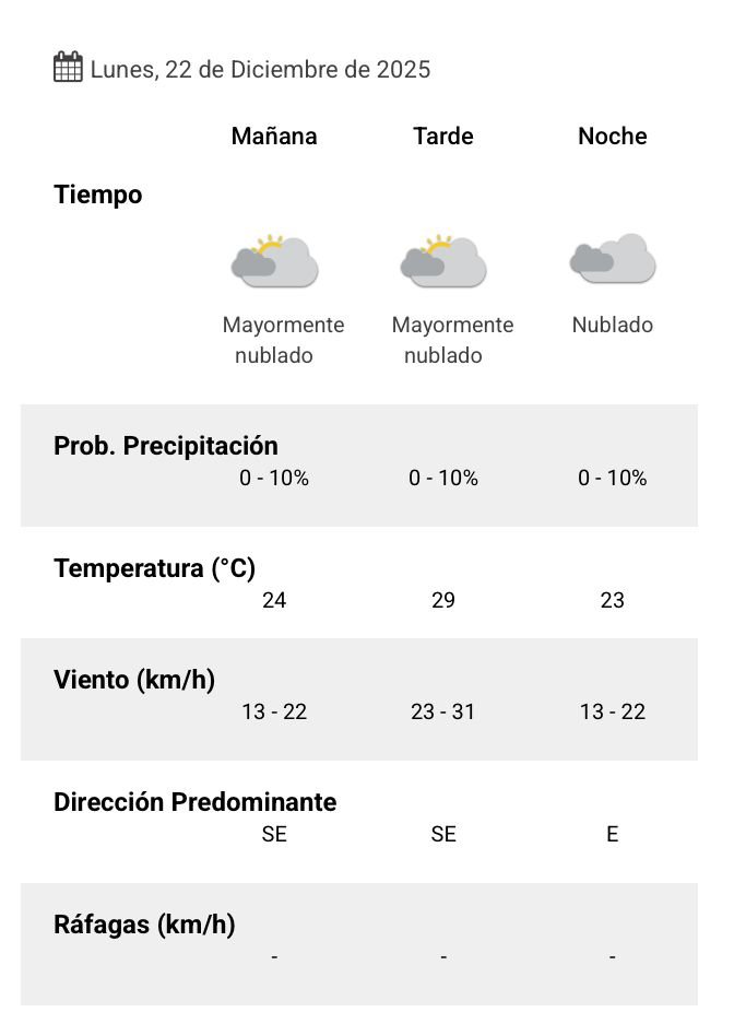El parte del servicio meteorológico prevé que para después del mediodía el cielo estará mayormente nublado y los vientos del sector sudeste tendrán velocidades estimadas de entre 23 y 31 km/h. La temperatura pronosticada sería de 29 grados.