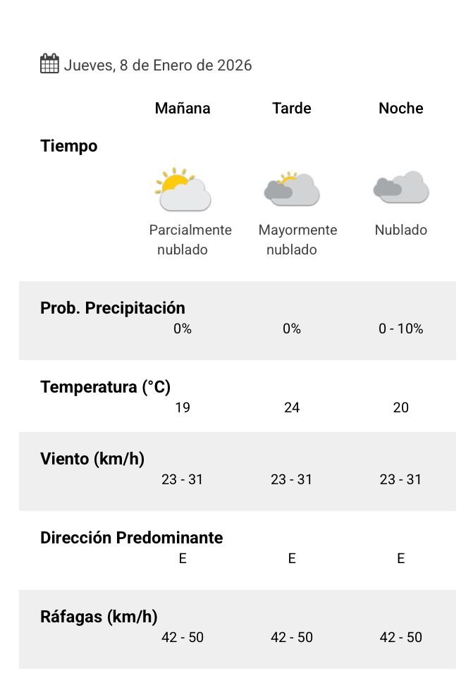 El parte del servicio meteorológico prevé que para después del mediodía el cielo estará nublado y los vientos del sector este tendrán velocidades estimadas de entre 23 y 31 km/h. La temperatura pronosticada sería de 24 grados.