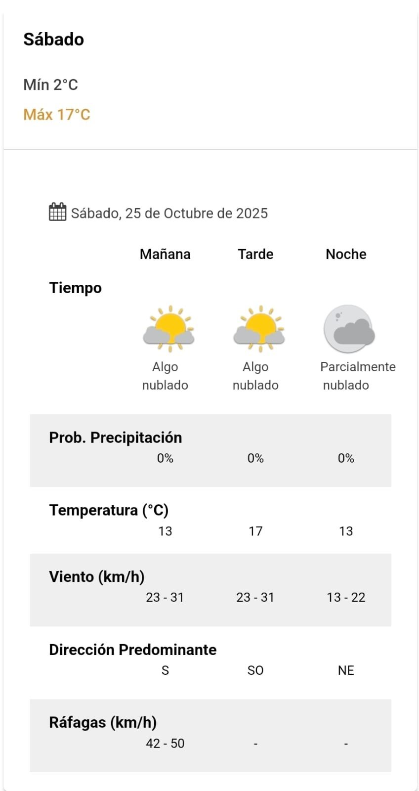 El parte del servicio meteorológico prevé que para después del mediodía el cielo estará algo nublado y los vientos del sector sudoeste tendrán velocidades estimadas de entre 23 y 31 km/h. La temperatura pronosticada sería de 17 grados.