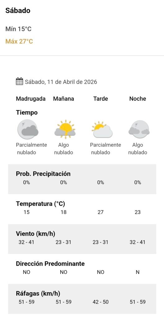 De acuerdo al parte del Servicio Meteorológico Nacional, el clima se presentaría sin lluvias, y los vientos del noroeste correrán a una velocidad de entre 23 y 31 kilómetros por hora. La humedad sería del 85 por ciento, y la visibilidad sería buena.