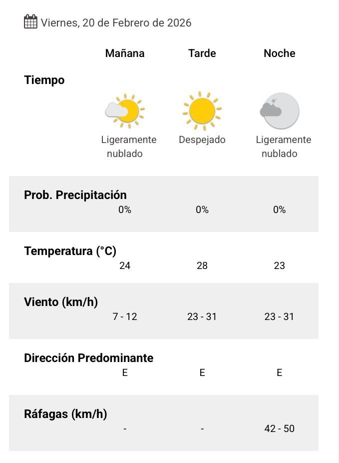 El parte del servicio meteorológico prevé que para después del mediodía el cielo estará parcialmente nublado y los vientos del sector este tendrán velocidades estimadas de entre 23 y 31 km/h. La temperatura pronosticada sería de 28 grados.
