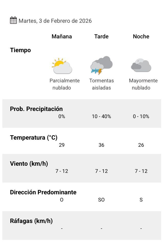El parte del servicio meteorológico prevé que para después del mediodía el cielo estará mayormente nublado y los vientos del sector sudoeste tendrán velocidades estimadas de entre 7 y 12 km/h. La temperatura pronosticada sería de 34 grados.