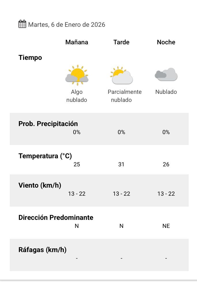 El parte del servicio meteorológico prevé que para después del mediodía el cielo estará parcialmente nublado y los vientos del sector norte tendrán velocidades estimadas de entre 13 y 22 km/h. La temperatura pronosticada sería de 31 grados.