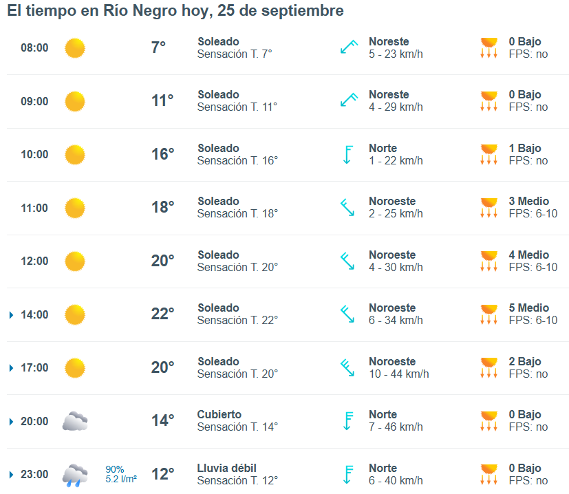 El pronóstico del tiempo para la ciudad de Río Negro, indica que hoy 25 de septiembre el cielo estará despejado por la mañana y la temperatura rondará entre 16 grados.