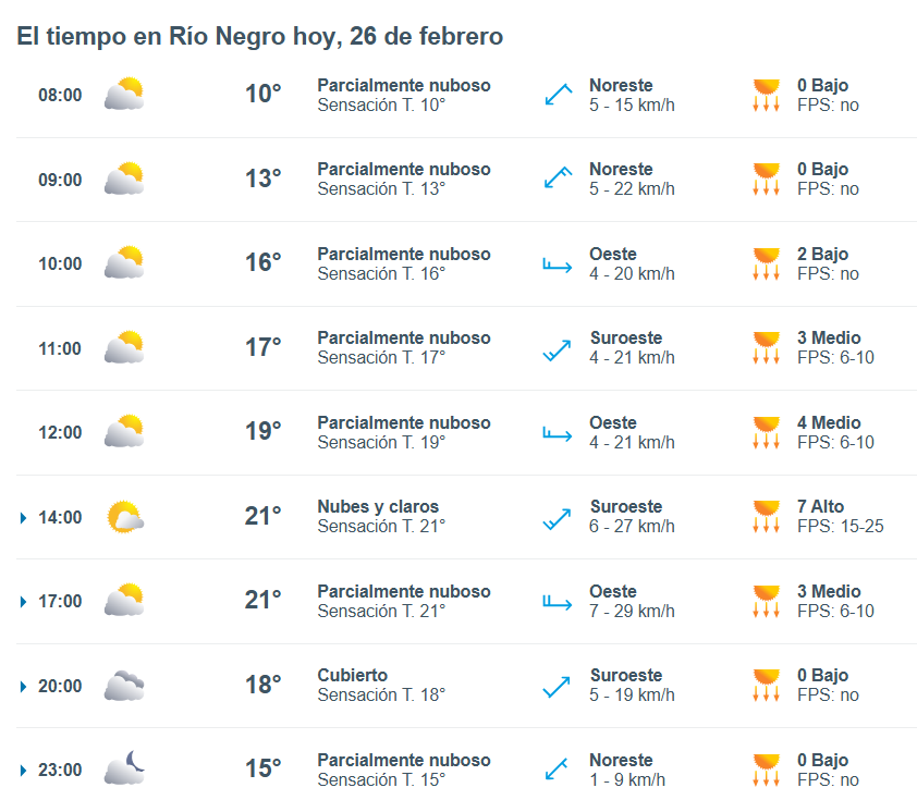 El pronóstico del tiempo para la ciudad de Río Negro, indica que hoy 26 de febrero el cielo estará algo nublado por la mañana y la temperatura rondará entre 12 grados.