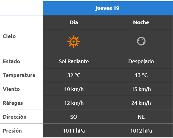 El parte del servicio meteorológico prevé que para después del mediodía el cielo estará ligeramente nublado y los vientos del sector norte tendrán velocidades estimadas de entre 23 y 31 km/h. La temperatura pronosticada sería de 29 grados.