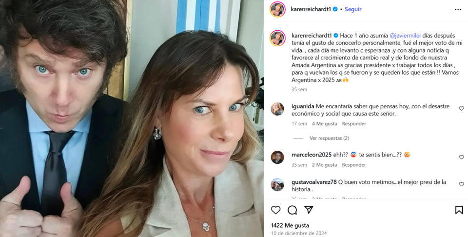 En política, Reichardt ha mostrado apoyo público a Javier Milei y a referentes libertarios desde el inicio del gobierno, compartiendo mensajes de respaldo en sus redes sociales. “Fue el mejor voto de mi vida. Cada día me levanto con esperanza”, expresó recientemente, reafirmando su alineación con el espacio.