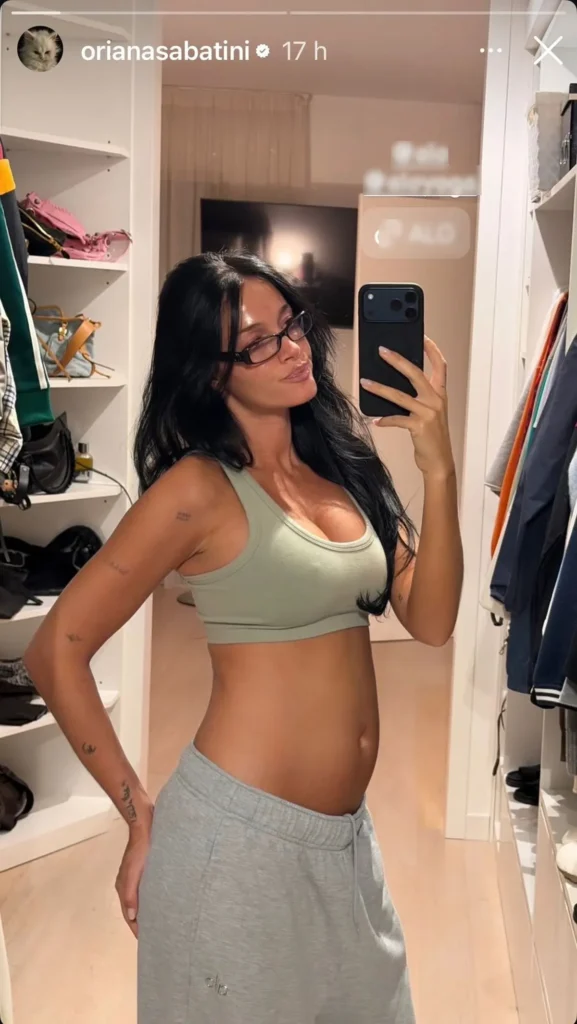 La imagen, tomada en el vestidor de su casa en Italia, muestra a la cantante y modelo frente al espejo, de perfil, luciendo un top deportivo verde claro y un pantalón de jogging gris de cintura baja. Oriana, que atraviesa el segundo trimestre de embarazo, vive este momento con emoción y nuevas sensaciones, y acompañó la postal con un gesto íntimo y natural.