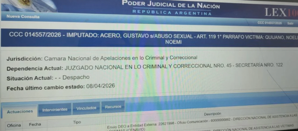 El expediente quedó radicado en el Juzgado Nacional en lo Criminal y Correccional Nº 45, bajo la carátula “Acero, Gustavo s/abuso sexual – art. 119”, con intervención de la Cámara Nacional de Apelaciones en lo Criminal y Correccional. El último movimiento judicial registrado data del 8 de abril.