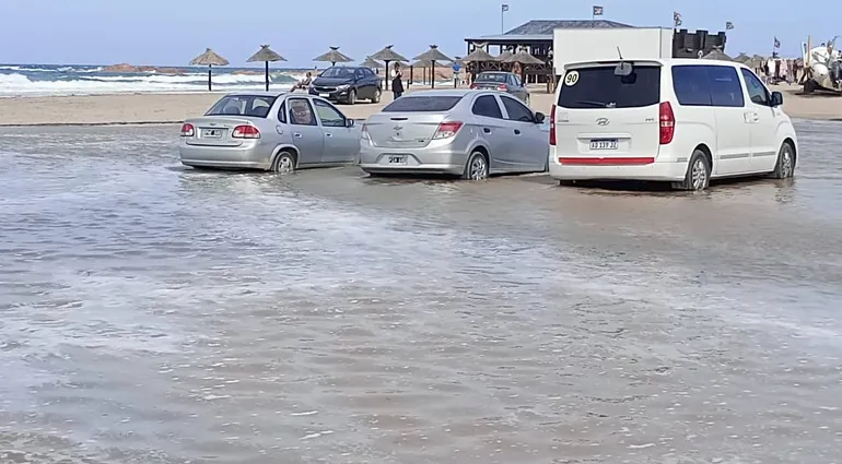Autos atrapados por la marea extraordinaria en Las Grutas