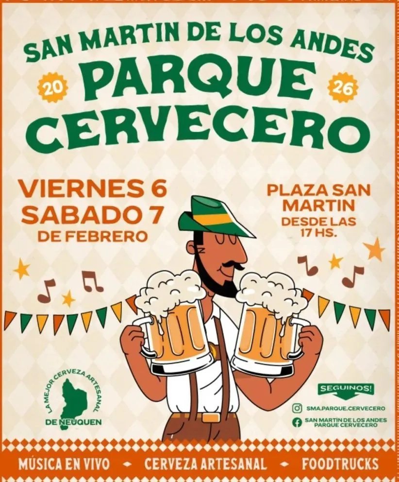 El viernes 6 y el sábado 7 de febrero se realizará la sexta edición de San Martín de los Andes Parque Cervecero, la fiesta de la cerveza artesanal de la ciudad que reúne a los principales cerveceros de la cordillera neuquina. La cita será en la Plaza San Martín y calle aledaña desde las 17 y hasta las 0.30. Habrá música en vivo y la mejor gastronomía regional.