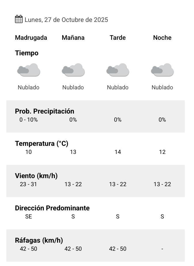 De acuerdo al parte del Servicio Meteorológico Nacional, el clima en esta presenta una probabilidad de lluvia de entre 10 y 40 por ciento, y los vientos del sur correrán a una velocidad de entre 13 y 22 kilómetros por hora. La humedad sería del 65 por ciento, y la visibilidad sería regular.