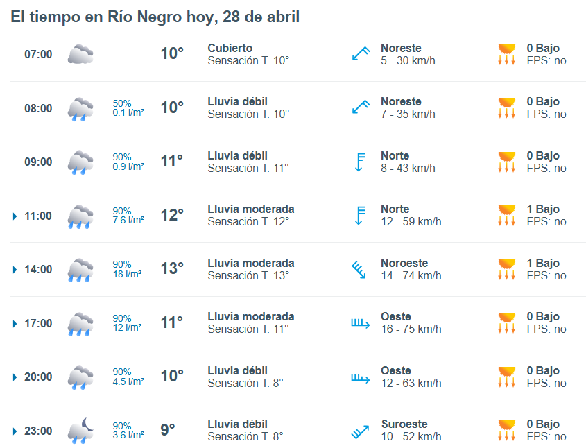 El pronóstico del tiempo para la ciudad de Río Negro, indica que hoy 28 de abril el cielo estará con lluvias y la temperatura rondará entre 10 grados.