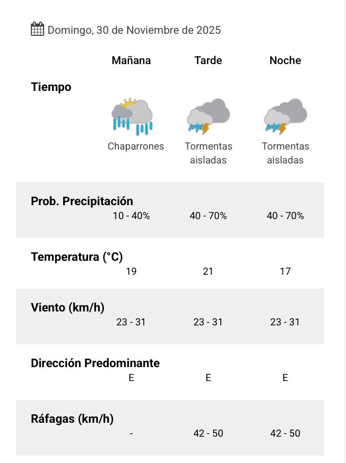 De acuerdo al parte del Servicio Meteorológico Nacional, el clima presenta una probabilidad de lluvia de entre 10 y 40 por ciento, y los vientos del este correrán a una velocidad de entre 23 y 31 kilómetros por hora. La humedad sería del 79 por ciento, y la visibilidad sería regular.