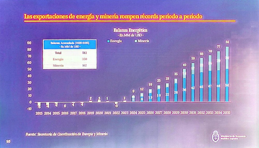 Según indicó, las exportaciones continúan en niveles récord y estimó que en 2026 la Argentina podría alcanzar por primera vez los US$ 100.000 millones anuales en ventas externas. En ese marco, señaló que para 2035 el país podría registrar US$ 350.000 millones de superávit comercial por energía y otros US$ 162.000 millones vinculados a la minería.
