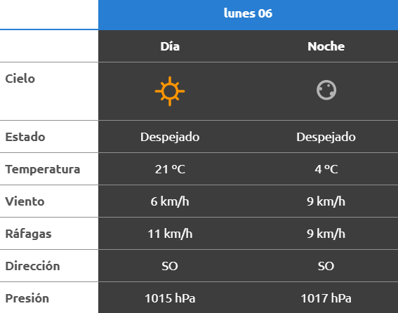 El parte del servicio meteorológico prevé que para después del mediodía el cielo estará ligeramente nublado y los vientos del sector sudoeste tendrán velocidades estimadas de entre 13 y 22 km/h. La temperatura pronosticada sería de 19 grados.