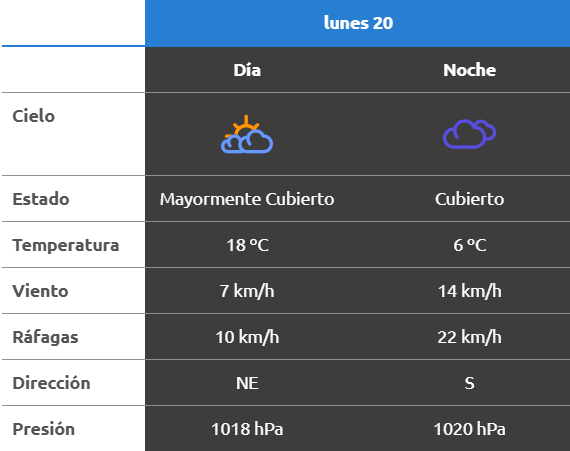 A la noche, el clima rondará los 12 grados, mientras que los vientos serán del noreste y soplarán a una velocidad de entre 13 y 22 kilómetros por hora. La probabilidad de lluvia estaría en el orden de entre 10 y 40 por ciento para esta franja del día.