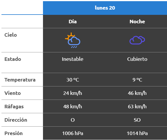 El parte del servicio meteorológico prevé que para después del mediodía el cielo estará mayormente nublado y los vientos del sector oeste tendrán velocidades estimadas de entre 32 y 41 km/h. La temperatura pronosticada sería de 30 grados.